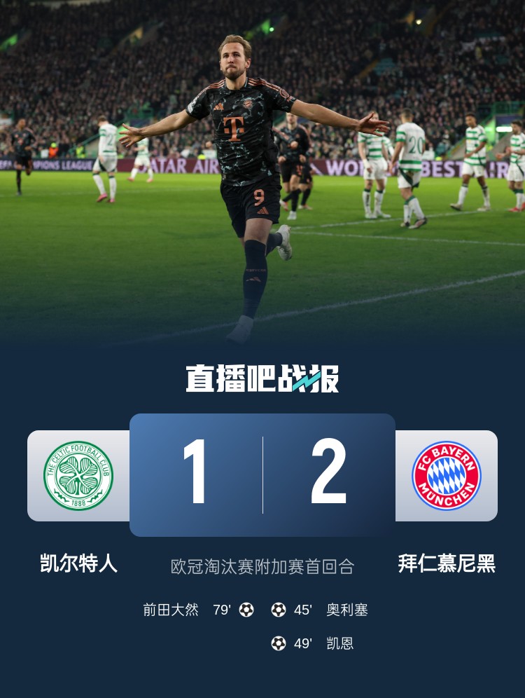 欧冠淘汰赛附加赛首回合,奥利塞、凯恩破门,拜仁2-1凯尔特人。