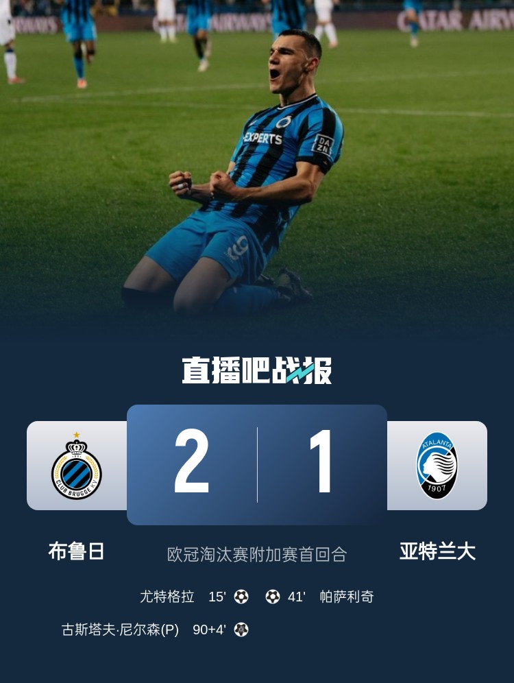 欧冠淘汰赛附加赛首回合,布鲁日2-1绝杀亚特兰大,绝杀点球引争议。