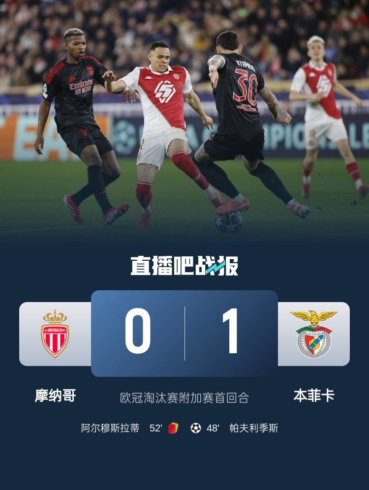 欧冠淘汰赛附加赛首回合,本菲卡客场1-0摩纳哥,帕夫利季斯制胜。