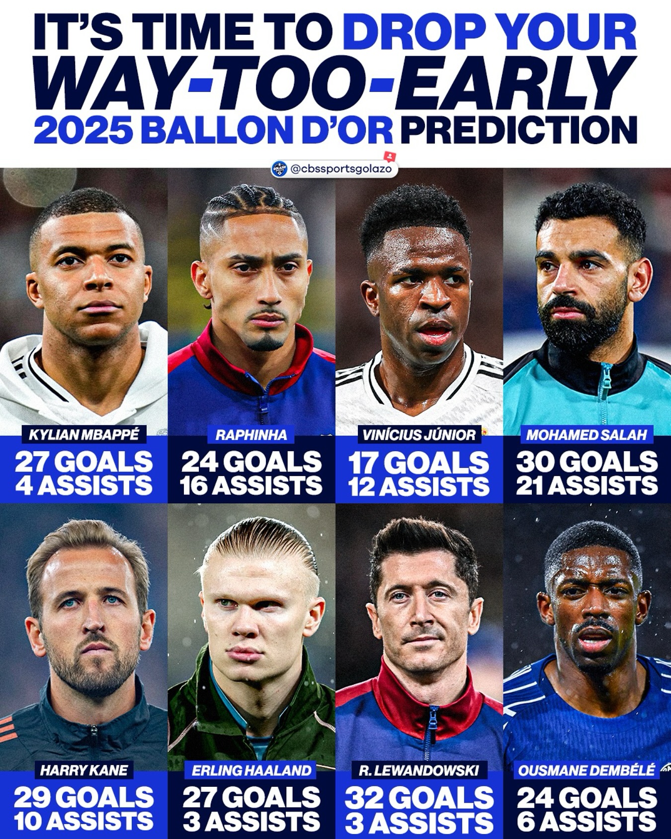 CBS列2025年金球奖热门候选数据,你更看好谁?姆巴佩:27球4助拉菲尼亚:24球16助维尼修斯:17球12助萨拉赫:30球21助凯恩:29球10助哈兰德:27球3助莱万:32球3助登贝莱:24球6助 本文标签: 足球 英超 曼城 利物浦 西甲 皇家马德里 巴塞罗那 意甲 德甲 拜仁慕尼黑 法甲 巴黎圣日耳曼 凯恩 姆巴佩 哈兰德 莱万 萨拉赫