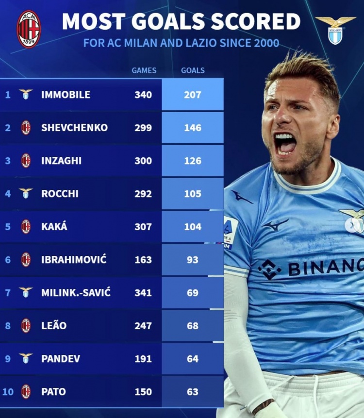3月3日讯 米兰将在本轮意甲焦点战主场迎战拉齐奥,《转会市场》也列出了两队新世纪射手榜。